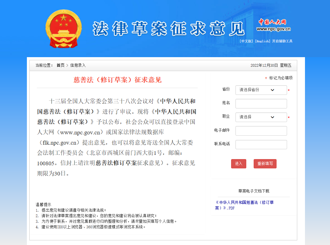 公众可以直接登录中国人大网 (www.npc.gov.cn) 或国家法律法规数据库 (flk.npc.gov.cn) 提出意见,也可以将意见寄送全国人大常委会法制工作委员会 ( 北京市西城区前门西大街 1 号,邮编: 100805 。信封上请注明慈善法修订草案征求意见 ) 。