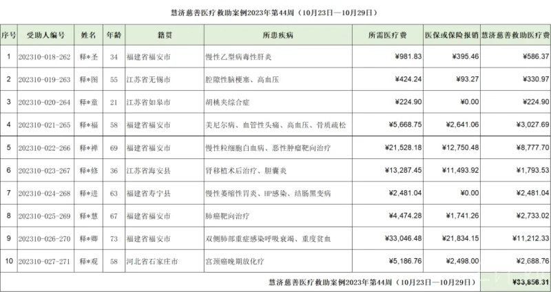 在医疗补助金方面,2023年10月23日—10月29日,慧济慈善共救助病患10人次,本年累计救助病患271人次,历史累计救助病患679例,具体信息如下。具体信息如下: