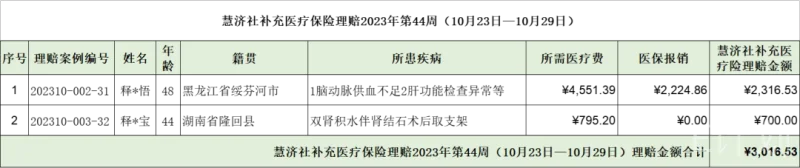 2023年10月23日--10月29日,慧济社补充医疗保险共理赔2例,本年累计理赔32例,具体信息如下: