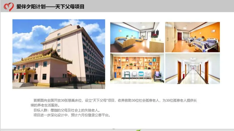 首期面向全国开放30张慈善床位,设立“天下父母”项目,收养救助30位社会孤寡老人,为30位孤寡老人提供长续的养老生活服务。