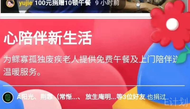 爱伴夕阳“心陪伴 新生活”助老公益项目 1.素食互助餐厅面向社会每日为老人提供免费素食午餐; 2.定期上门陪伴特殊老人(鳏寡孤独、重疾重残),为他们提供了一个抒发生命、畅怀情感的平台, 从而让他们在原本孤苦愁闷的生活中注入新的活力。